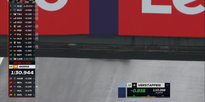 现场的能见度非常糟糕,诺里斯的首个飞驰圈成绩比干地要慢20秒左右!