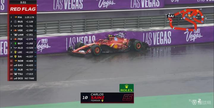 红旗×2!塞恩斯在2号弯spin上墙,赛车后悬挂严重受损,Q2暂停!