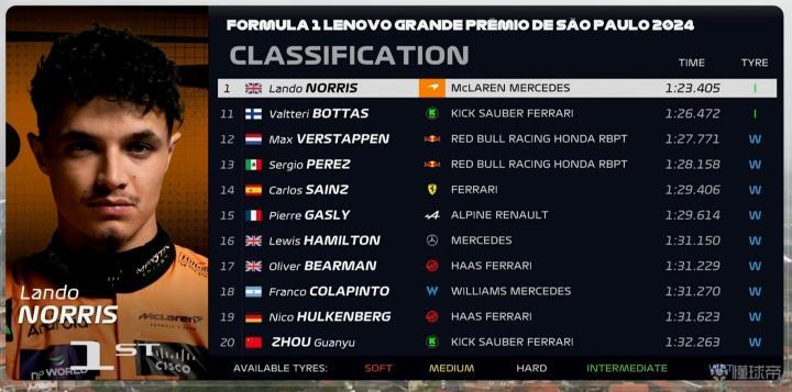 目前诺里斯还处在淘汰区,有6位车手做出半雨胎的成绩,博塔斯排在第7!