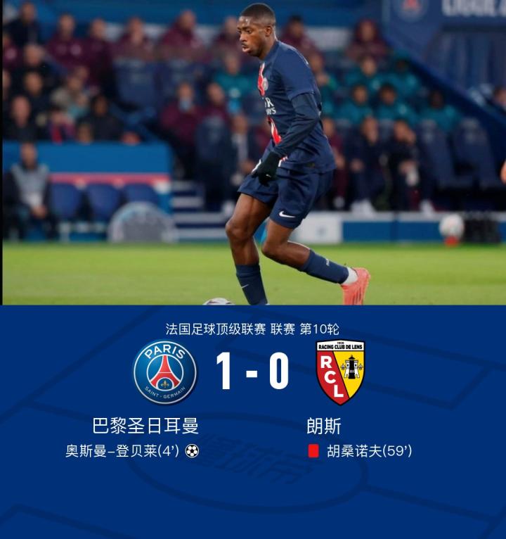 在法国足球顶级联赛第10轮的较量中,巴黎圣日耳曼坐镇主场迎战朗斯。上半场巴尔科拉助攻登贝莱闪击。下半场胡桑诺夫铲到阿什拉夫脚踝,VAR介入后裁判出示红牌。最终,巴黎圣日耳曼以1-0小胜朗斯,取得了本场比赛的胜利。