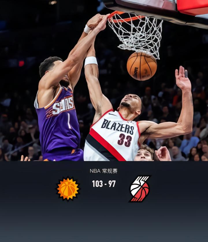第四节太阳德文-布克拿下10分,开拓者班顿拿下12分,最终太阳103-97战胜开拓者