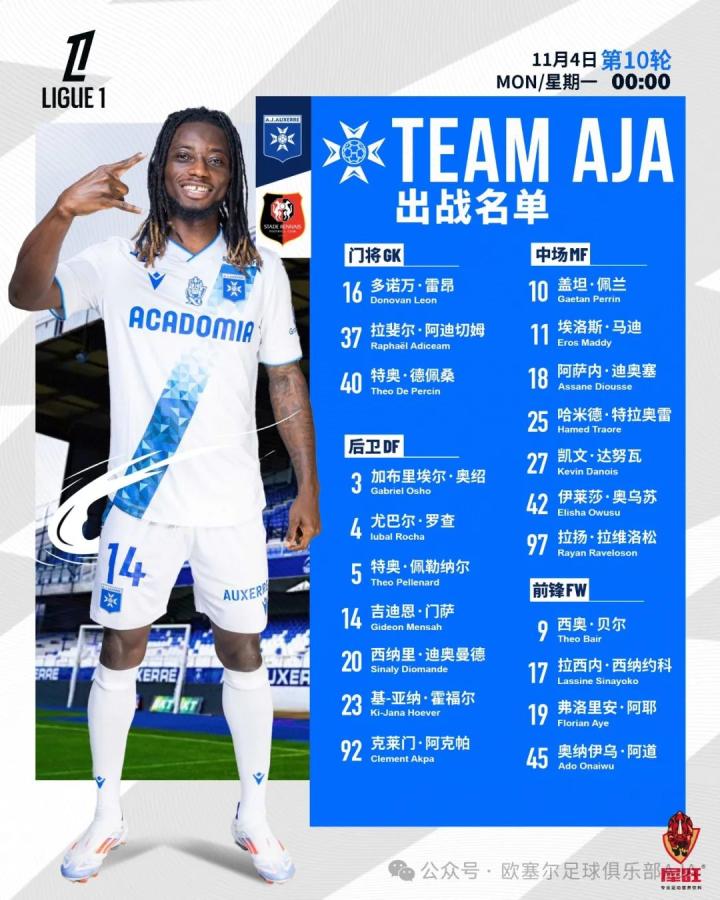 法国时间11月3号下午3点(北京时间4号凌晨0点),欧塞尔将在主场进行第10轮联赛,对手是目前排名联赛第11位的雷恩队。欧塞尔在上轮联赛中两度落后,两度扳平,顽强战平强敌里昂,收获本赛季首个客场积分。本轮坐镇阿贝·德尚球场,我们力争延续主场连胜。