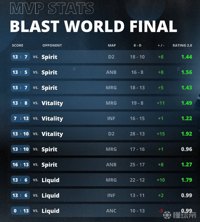 小孩m0NESY在此次系列赛出战11张地图,场均rating达到1.35,半决赛与决赛六张地图最低单图rating也能够达到1.22。