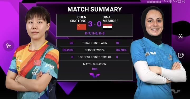 北京时间11月3日,WTT法兰克福冠军赛女子单打1/16决赛,由中国选手陈幸同对阵埃及选手蒂娜-梅谢芙。本次比赛是二人在国际赛场上的第一次交手。经过三局的较量,陈幸同以3-0战胜对手,晋级女单16强。