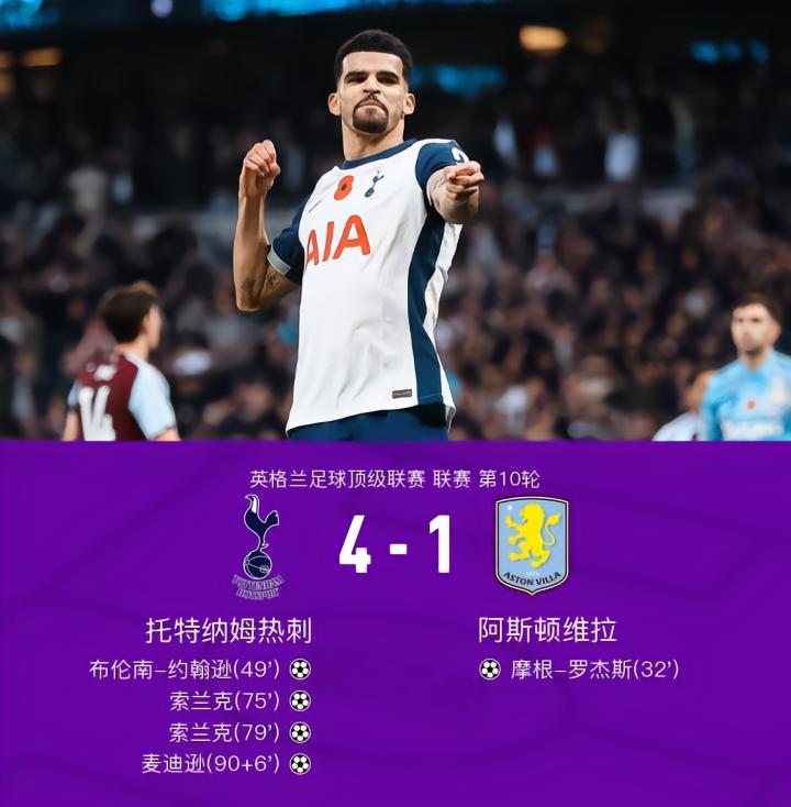 北京时间11月3日22:00,英超第10轮,热刺主场迎战维拉。上半场,奥纳纳头球被维卡里奥神勇扑出形成角球,摩根-罗杰斯抓住角球机会破门打进上半场唯一进球,本坦库尔多次远射造险并且身后放铲奥纳纳逃过吃牌,随后沃特金斯低射打偏错失反击机会;下半场,孙兴慜助攻布伦南-约翰逊扳平比分,索兰克短时间内梅开二度,替补登场送上助攻的里沙利松伤退,麦迪逊补时阶段任意球直接破门锁定胜局。最终热刺主场4-1大胜维拉。