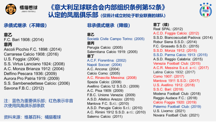 笔者去年曾撰文专题介绍意大利足球的“凤凰俱乐部(Phoenix Club)”制度。【相关阅读:有没有一种办法,能让破产的球队重新回来?】同样经历过金元泡沫和俱乐部解散潮的意大利足球,通过立法建立了完善的俱乐部体育荣誉继承体系:老俱乐部破产解散后,新成立的俱乐部经当地政府批准并收购老俱乐部IP的情况下,意大利足协许可其继承老俱乐部历史和荣誉的资格,还能避免从最低级别起步,直接从意丁打起。中国意甲球迷熟知的那不勒斯、帕尔马、佛罗伦萨等队的现行主体都是凤凰俱乐部。