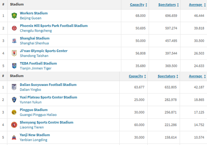 本赛季中超、中甲上座人数前五统计(德转)