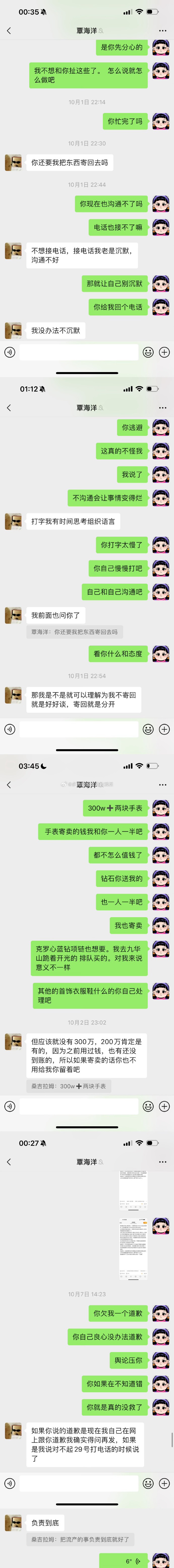 1.最想解释的是一百万转账的事情: 覃海洋先生被我发现数次出轨 多次聊骚后 2022年7月我和他翻脸 是真的太痛苦太生气了。当时就想要分开曝光他,是覃海洋先生极力挽回,并且让他的母亲给我打100w元人民币(他的比赛奖金) 让我作为保管 并向我承诺不会再犯错误,如果再犯错误就锤死他 把他的钱花没。 她的妈妈当时也用了很过激的方式让我原谅他 让我别曝光她儿子 原谅覃海洋最后一次 于是 我就又心软了。 在他知道他母亲为了他做过激的事情后,我们双方之间产生了很大的隔阂,还会保持联系但是一年多没有见面,但他给我买礼物的时候,我会给他回礼,永远都比他的贵。