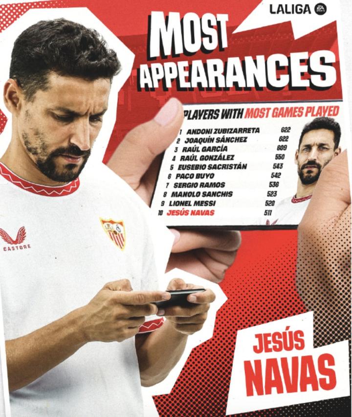 纳瓦斯出场次数超越卡西,511次出场跻身西甲历史出场榜前十来杯冰可罗 @懂球帝2024-11-04 12:20在西甲第12轮的比赛中,塞维利亚主场0-2不敌皇家社会。现年38岁的赫苏斯-纳瓦斯在比赛第25分钟替补出场,并就此迎来了自己职业生涯里程碑式的一战,以511次出场跻身西甲历史出场榜前十位。西甲官方表示:在对阵皇家社会的比赛中,塞维利亚足球俱乐部队长纳瓦斯替补登场,就此正式超越卡西利亚斯,以511次出场跻身西甲历史出场榜前十位!展开更多