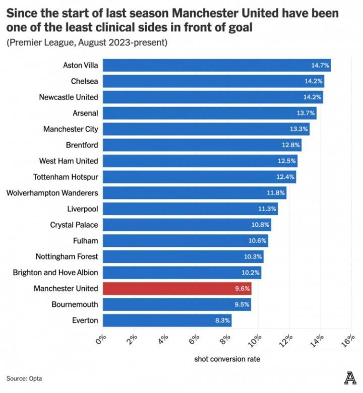 (图)上赛季,曼联就是英超射门转化率最低的球队之一,指望范尼在短时间内就改变这一切并不现实。