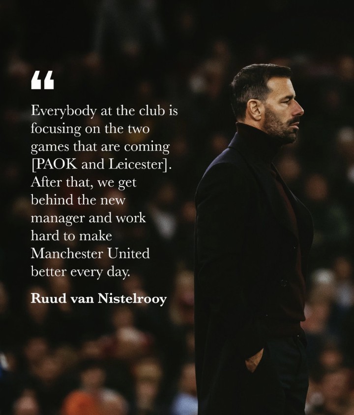 范尼斯特鲁伊表示:“俱乐部的每个人都在关注即将到来的两场比赛(对阵塞萨洛尼基和莱斯特城)。在那之后,我们会支持新教练,努力让曼联每天都变得更好。”