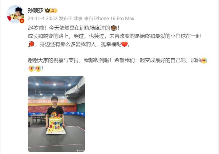 孙颖莎在社媒发文写道:“24岁啦!今天依然是在训练场度过的生日!成长和蜕变的路上,哭过,也笑过,未曾改变的是始终和最爱的小白球在一起,身边还有那么多爱我的人,挺幸福哒。”