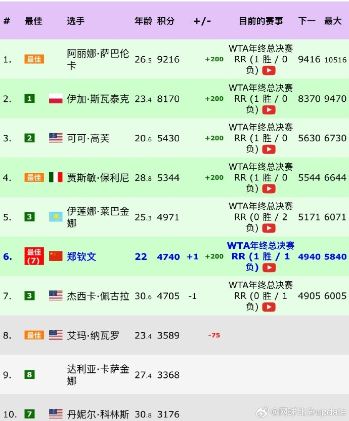 郑钦文拿下总决赛首胜后,获得了200个积分,即时世界排名超越佩古拉,来到第6位,距离第5名的莱巴金娜还差231分。