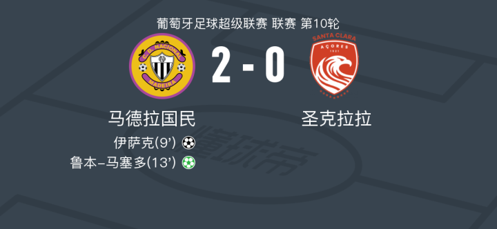马德拉国民2-0圣克拉拉,伊萨克建功,鲁本-马塞多锁定胜局