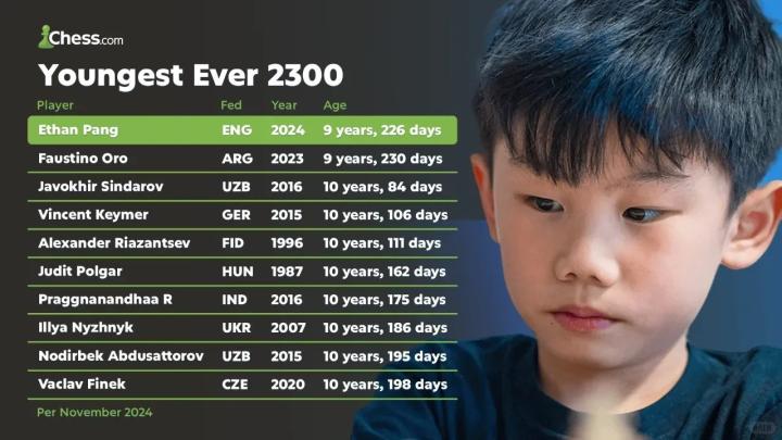伊桑-庞在本周的Vezerkepzo IM锦标赛中获得了70分,最终FIDE达到了2303分。这一成就让他打破了阿根廷明星国际大师福斯蒂诺-奥罗的记录,成为了有史以来最年轻达到2300分并获得国际棋联大师头衔的棋手。