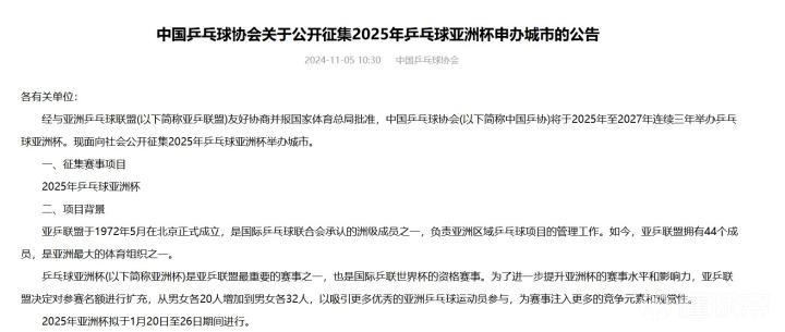 11月5日,中国乒乓球协会官网发布公告,将于2025年至2027年连续三年举办乒乓球亚洲杯,现面向社会公开征集2025年乒乓球亚洲杯举办城市。
