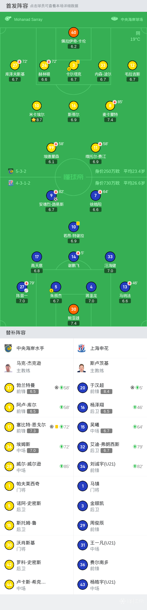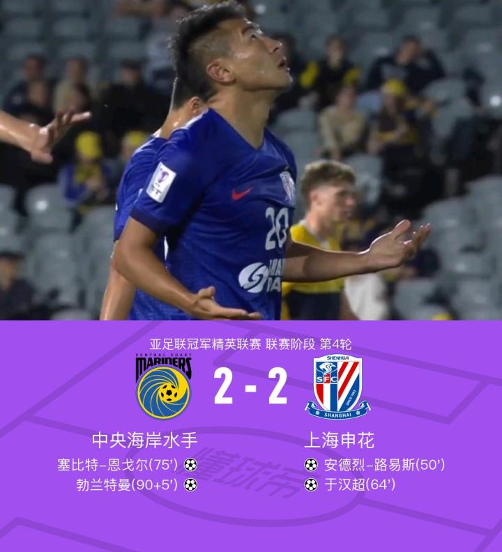在亚足联冠军精英联赛的较量中,中央海岸水手与上海申花展开了一场激烈的对决。上半场谢鹏飞与对手争顶发生碰撞倒地,于汉超替补登场。下半场开始时马纳法因伤被换下,之后于汉超送助攻,安德烈-路易斯转身打远角破门,之后于汉超兜射远角破门扩大比分,随后恩戈尔过掉鲍亚雄推射破门扳回一球,补时最后时刻勃兰特曼绝平。最终申花客场2-2战平中央海岸水手。