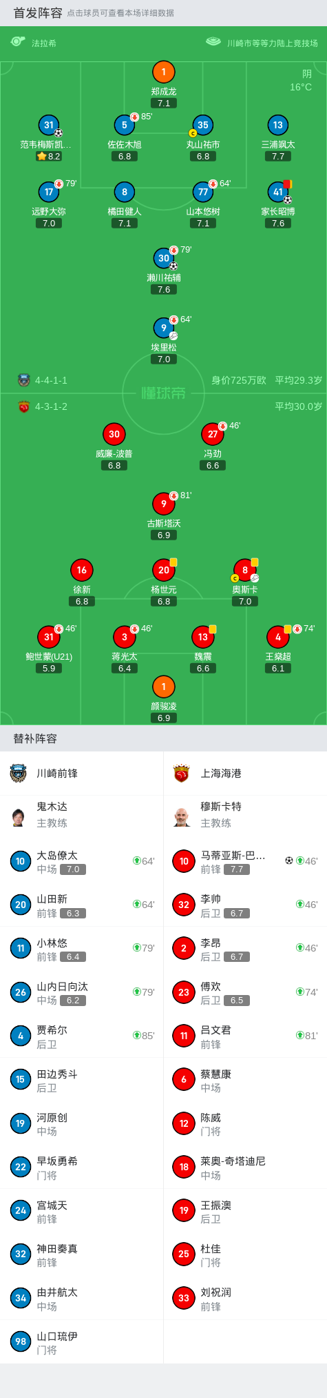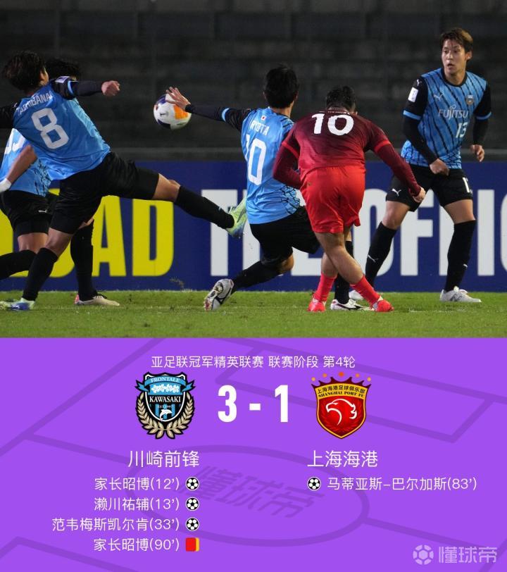 北京时间11月5日亚冠精英联赛联赛阶段第4轮,川崎前锋对阵上海海港。比赛第12分钟,家长昭博凌空射门得分,1分钟后,濑川祐辅补射再下一城,第33分钟,范韦梅斯凯尔肯禁区内得分。第83分钟,巴尔加斯接奥斯卡助攻得分,最后时刻家长昭博吃到第二张黄牌被罚下。最终比分川崎前锋3-1上海海港。