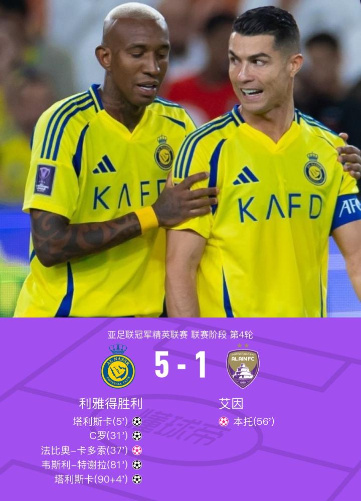 利雅得胜利5-1艾因,C罗破门,塔利斯卡双响,特谢拉传射