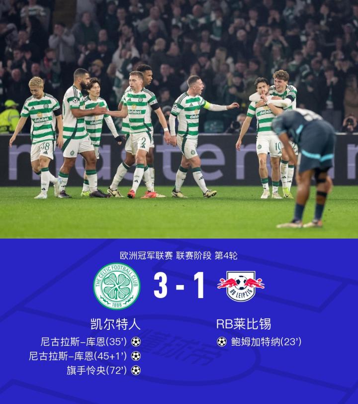 欧冠四连败!莱比锡1-3凯尔特人,库恩双响,旗手怜央破门