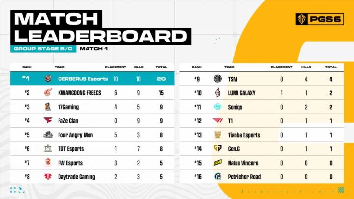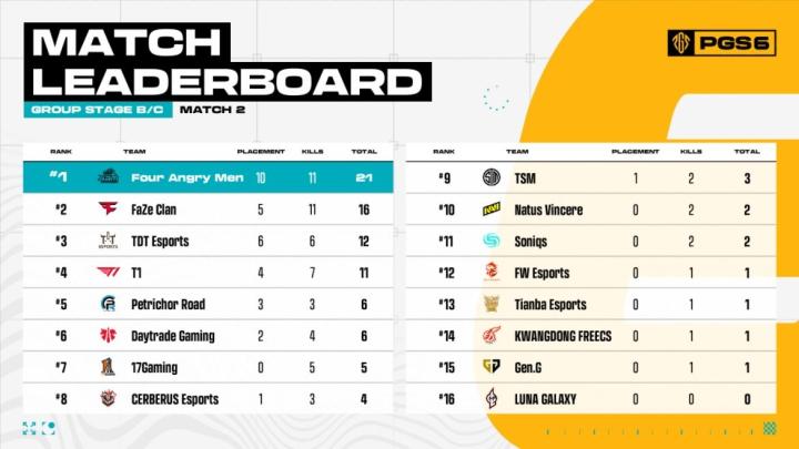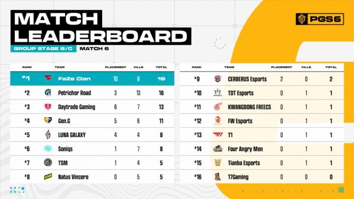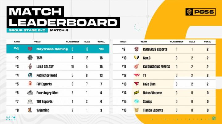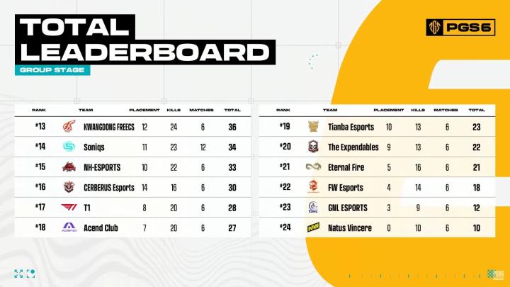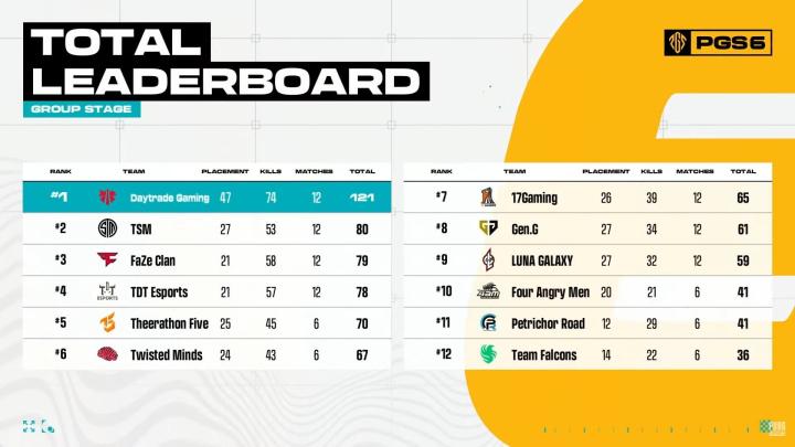 PGS6小组赛:DAY领跑;17两日65分,天霸单日吃一鸡仅拿23分