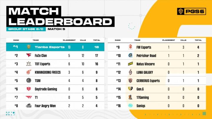 MATCH5,天霸在与FaZe、TDT的混战中占得先机成功吃鸡得到18分。