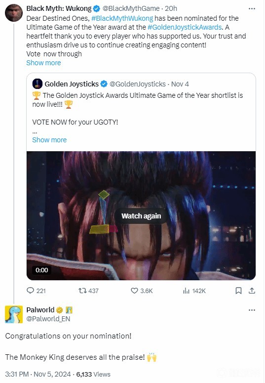在获得金摇杆年度游戏提名后,《黑神话:悟空》在官方社媒也转发庆祝并发动粉丝们为自己投票。