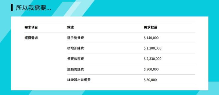 在募集网站中,高承睿详细列举了自己的经费需求、训练计划和预期效益。他表示:经费需求主要集中在选手营养费、移地训练费、参赛旅运费、运动防护费、训练器材装备费。
