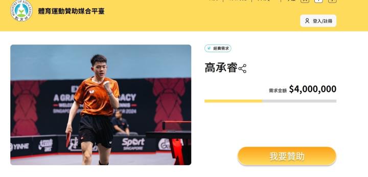 因缺乏比赛资金,中国台北乒乓球运动员高承睿向社会募集400万台币