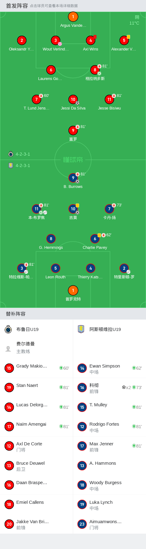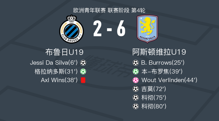 阿斯顿维拉U19 6-2大胜布鲁日U19 ,科彻双响,本-布罗焦1射1传
