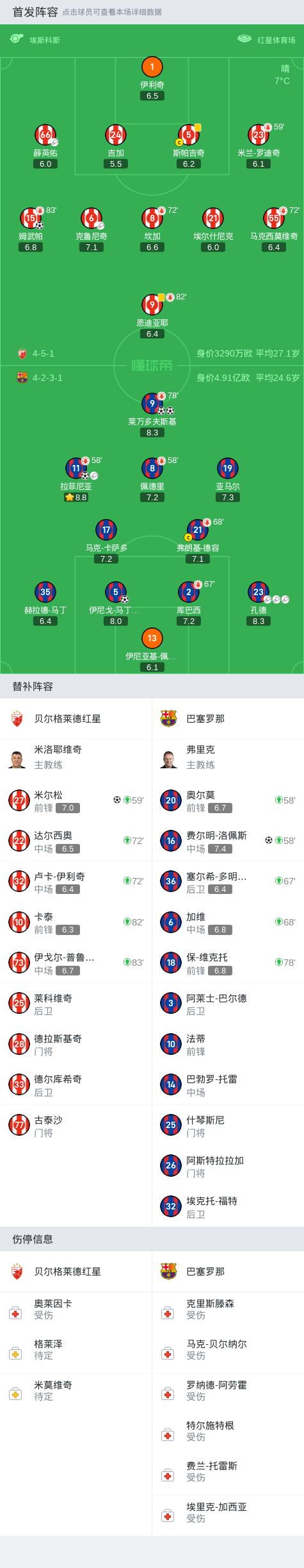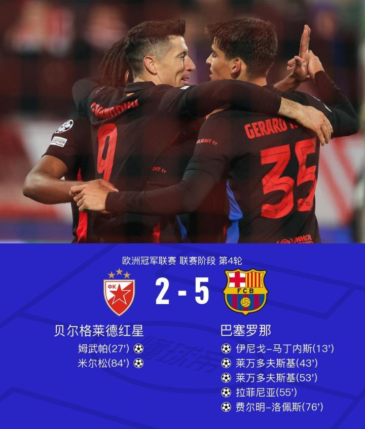 北京时间11月7日4:00,欧冠联赛阶段第4轮,巴塞罗那客场挑战贝尔格莱德红星。上半场,拉菲尼亚助攻伊尼戈-马丁内斯头球破门,随后拉菲尼亚主罚角球直接击中立柱,姆武帕搓射破门扳平比分,半场结束前,拉菲尼亚远射击中立柱弹出,莱万多夫斯基门前补射破门。下半场,佩德里兜射打偏,孔德助攻莱万多夫斯基破门,随后孔德再送两次助攻,拉菲尼亚、费尔明-洛佩斯扩大比分,比赛尾声阶段,米尔松兜射扳回一分,最终,巴萨客场5-2贝尔格莱德红星迎各项赛事七连胜。