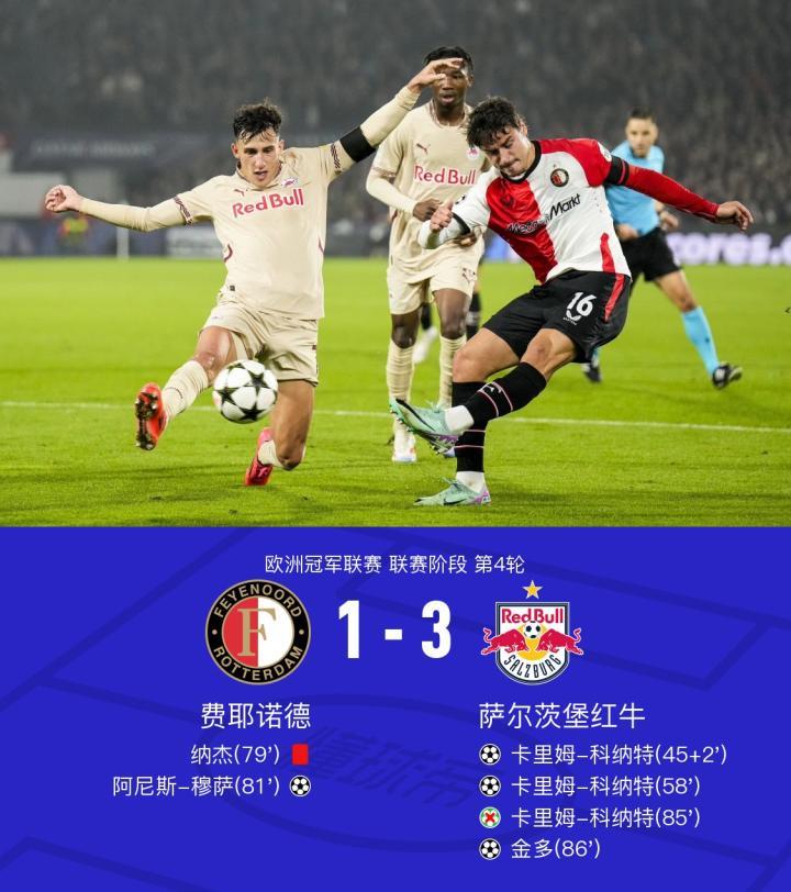 在欧洲冠军联赛的较量中,费耶诺德迎战萨尔茨堡红牛。上半场补时阶段,卡里姆-科纳特破门打破场上僵局。下半场,卡里姆-科纳特再下一城梅开二度,纳杰染红,阿尼斯-穆萨扳回一分,随后萨尔茨堡红牛获得点球机会,卡里姆-科纳特未能罚入点球,金多破门锁定胜局,最终,萨尔茨堡红牛3比1战胜费耶诺德。