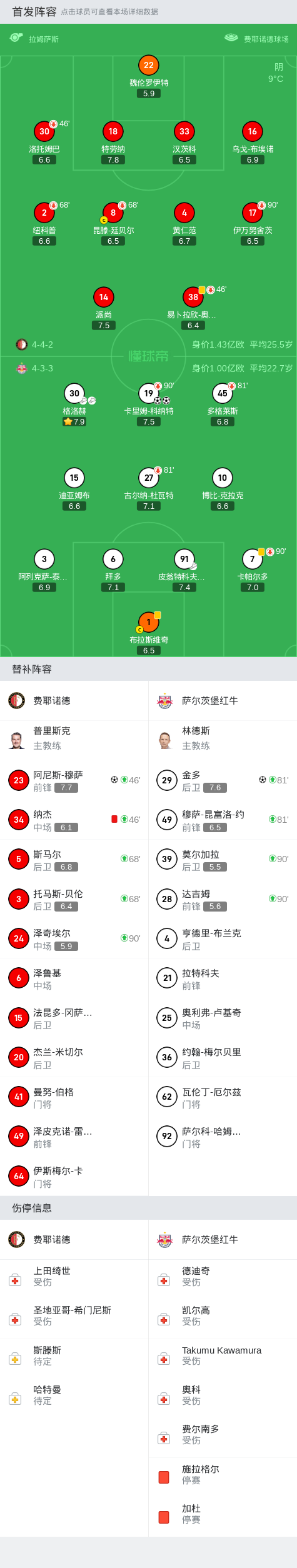 费耶诺德1-3萨尔茨堡红牛,科纳特双响+丢点,穆萨破门