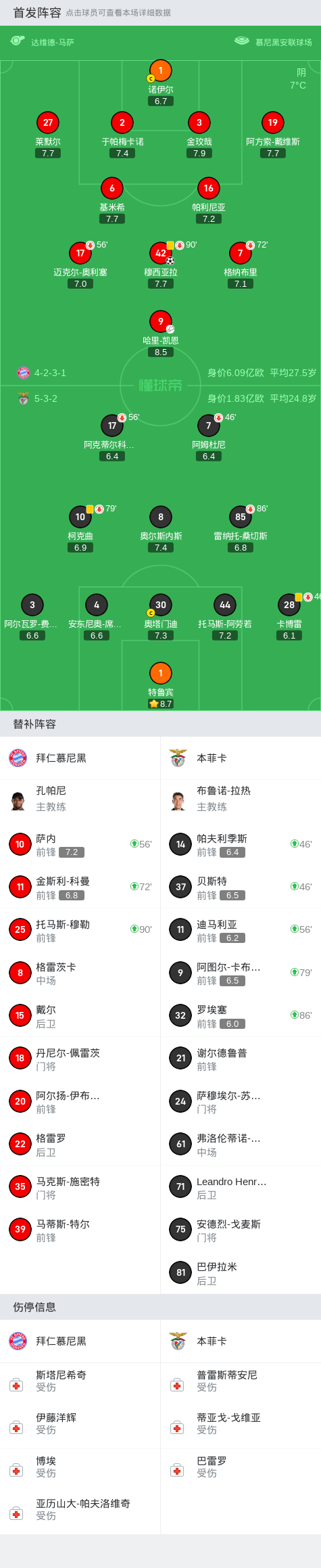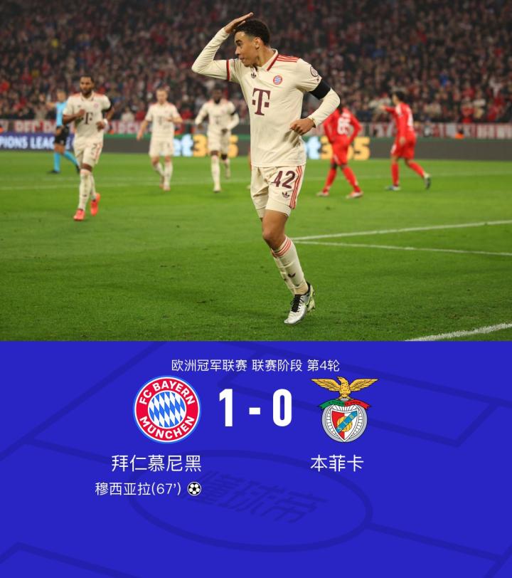 拜仁1-0本菲卡,穆西亚拉制胜,凯恩助攻,特鲁宾难救主