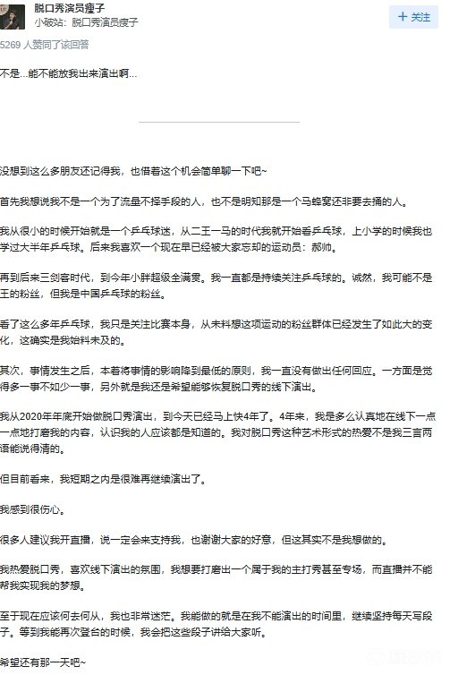瘦子表示,自己看了很多年乒乓球,但未料想到现在乒乓球的粉丝群体发生了如此大的变化。目前短期内自己很难再继续演出了,但自己还是希望能恢复线下演出。