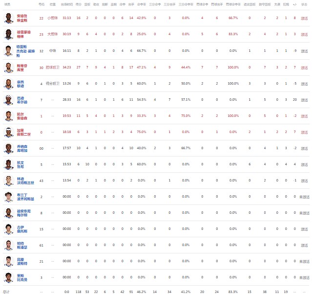 金州勇士斯蒂芬-库里27分7板9助4断1帽,维金斯16分2板,希尔德16分6板1助1帽。