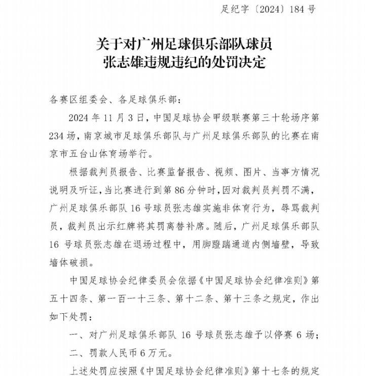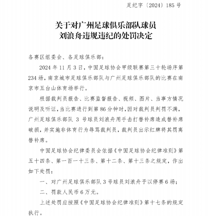 足协官方:广州队刘浪舟、张志雄停赛6场,罚款6万元