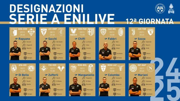 意大利裁判协会公布了意甲第12轮各场比赛的裁判员名单,国际米兰主场与那不勒斯的榜首大战由马里亚尼吹罚,都灵德比的比赛主裁则是索扎。