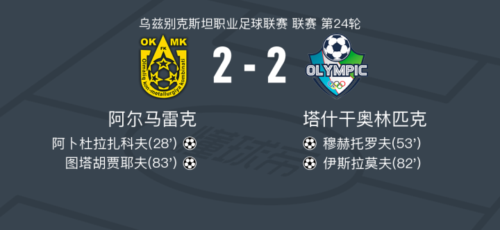 第83分钟,阿尔马雷克球员吉约索夫助攻图塔胡贾耶夫打入一球。