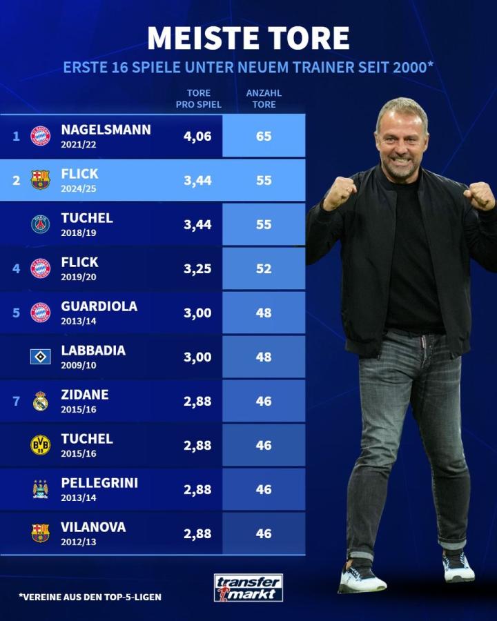 弗里克执教巴塞罗那前16场比赛球队已打入55球,据德国转会市场网站统计,自2000年以来,只有纳格尔斯曼在执教单一五大联赛球队前16场比赛的进球数更多。
