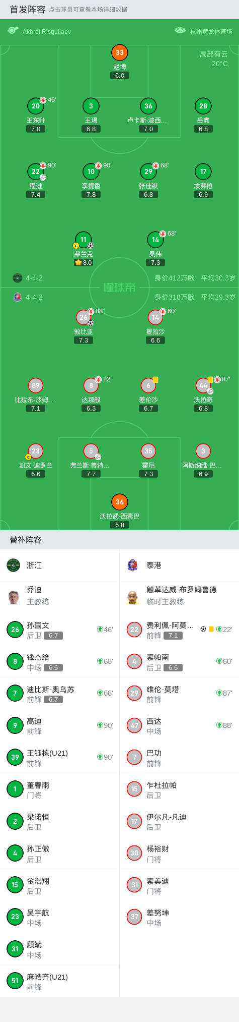 第7分钟,梦幻开局!程进助攻弗兰克铲射破门,浙江1-0泰港