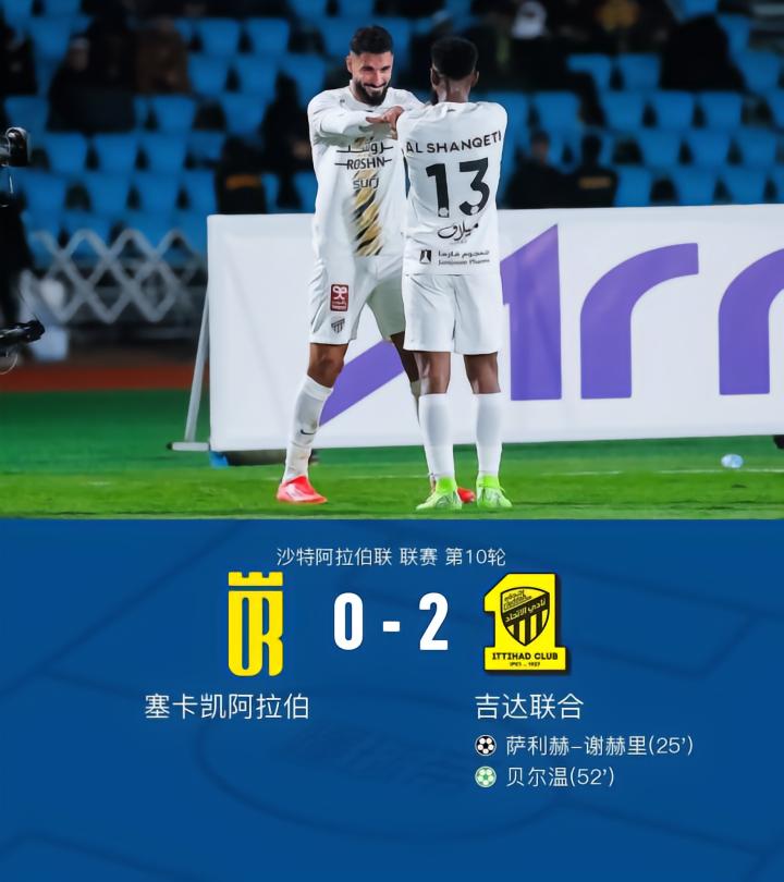 吉达联合2-0塞卡凯阿拉伯,谢赫里破门,贝尔温点射