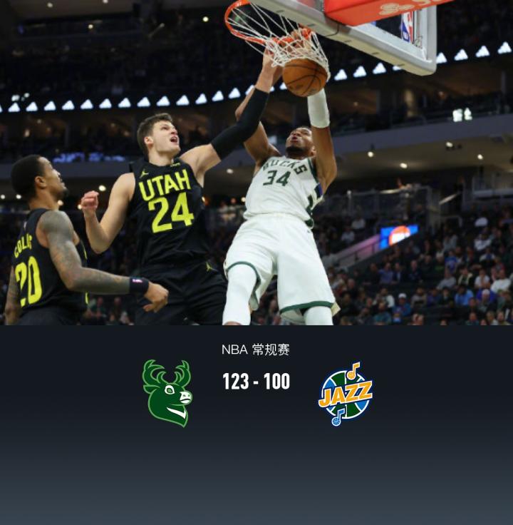 第四节雄鹿波蒂斯拿下10分,爵士柯林斯拿下6分,最终雄鹿123-100战胜爵士