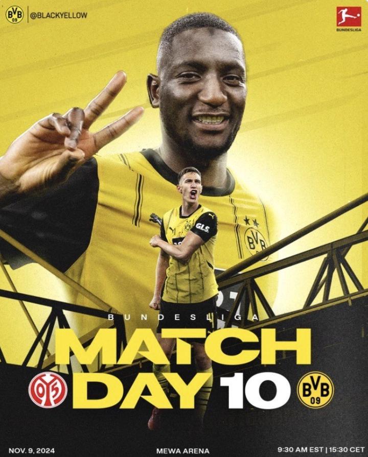 北京时间11月9日晚上22:30分,德甲第11轮,多特蒙德将前往客场挑战美因茨。赛前,多特蒙德官方发布了本场比赛的预热海报。
