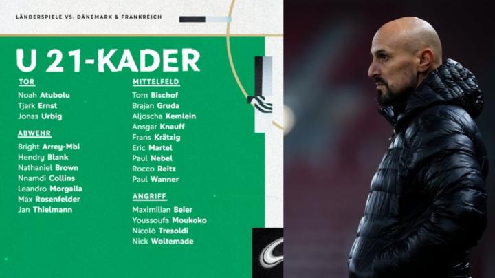 在此次集训中,法兰克福的恩纳姆迪·科林斯、霍芬海姆的汤姆·比朔夫和柏林联的阿廖沙·凯姆莱因为首次入选U21。此外,法兰克福的纳坦尼尔·布朗和尼斯的尤素法·穆科科重返球队。
