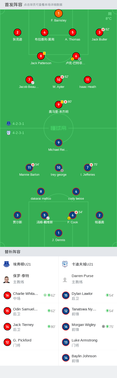 第2分钟,埃弗顿U21球员Jacob Beaumont-Clark助攻卢克-巴特菲尔德打入一球。