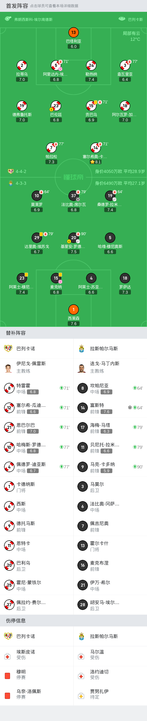 在西班牙足球甲级联赛第13轮的较量中,巴列卡诺坐镇主场迎战拉斯帕尔马斯。比赛中,拉斯帕尔马斯的法比奥-席尔瓦在队友桑德罗-拉米雷斯的助攻下率先破门为客队取得领先。随后,巴列卡诺的阿里达内-埃尔南德斯不慎将球打入自家球门扩大了拉斯帕尔马斯的优势。紧接着,富斯特在基里安-罗德里格斯的助攻下再下一城,比赛接近尾声时,拉斯帕尔马斯的麦克纳同样出现失误,将球送入自家球门。最终,拉斯帕尔马斯以3比1战胜巴列卡诺,取得了本场比赛的胜利。