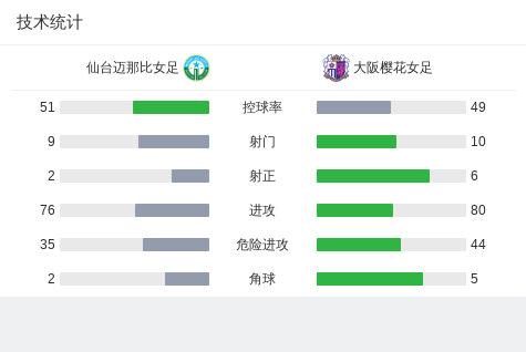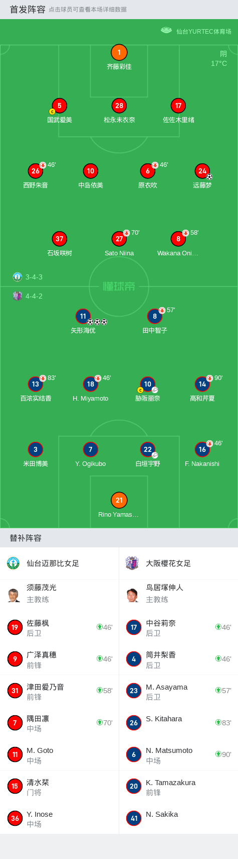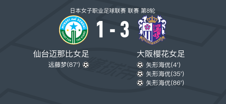 大阪樱花女足3-1仙台迈那比女足,矢形海优帽子戏法