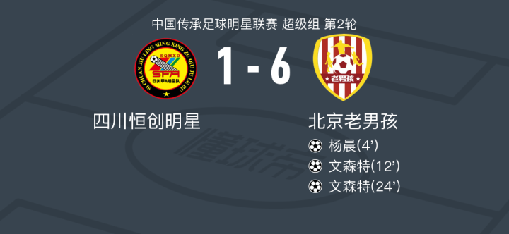 在中国传承足球明星联赛超级组的第二轮比赛中,北京老男孩队客场挑战四川恒创明星队。比赛中,北京老男孩展现了强大的进攻实力。杨晨率先为球队打开局面,随后杜文辉送出精妙助攻,帮助文森特再下一城。文森特状态火热,再次攻破对方球门,完成个人梅开二度。最终,北京老男孩以6比1的比分大胜四川恒创明星,取得了一场酣畅淋漓的胜利。