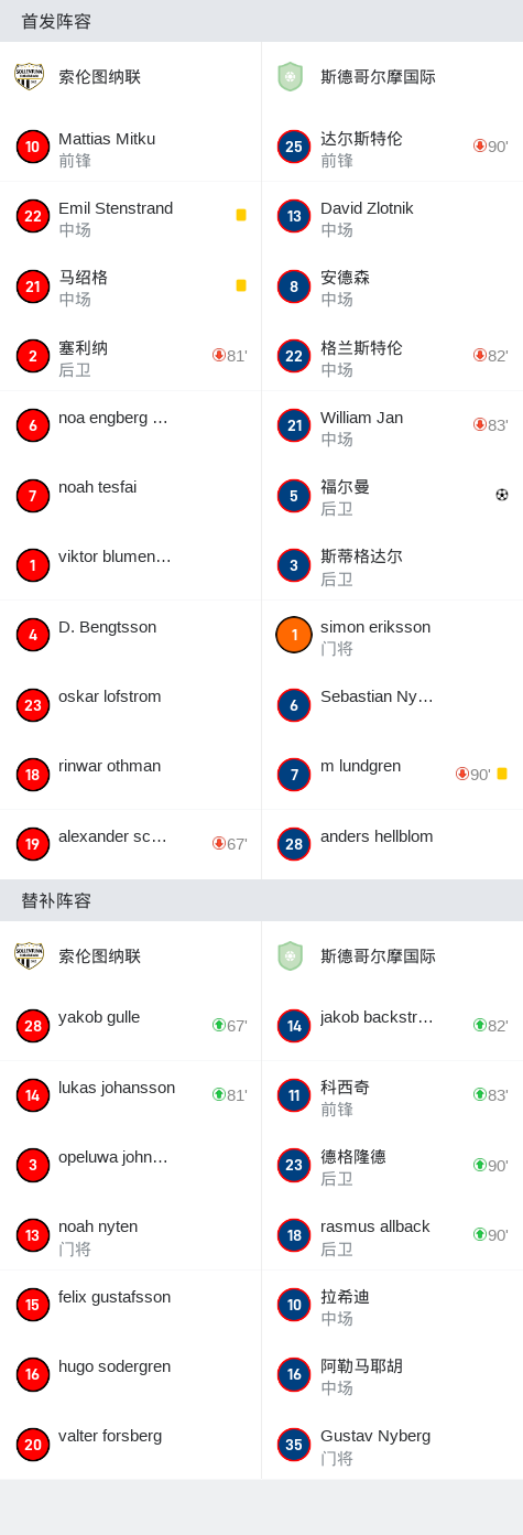 斯德哥尔摩国际1-0索伦图纳联取瑞典乙4连胜,福尔曼一剑封喉战报bot @懂球帝2024-11-09 21:58在瑞典足球乙级联赛北部第30轮的较量中,索伦图纳联坐镇主场迎战斯德哥尔摩国际。比赛中,斯德哥尔摩国际的福尔曼成功攻入一球,帮助球队取得领先。最终,斯德哥尔摩国际以1比0战胜索伦图纳联,取得了本场比赛的胜利。点击查看本场比赛详细数据>>精彩瞬间第69分钟,斯德哥尔摩国际球员福尔曼打入一球。 球队阵容 技术统计 展开更多
